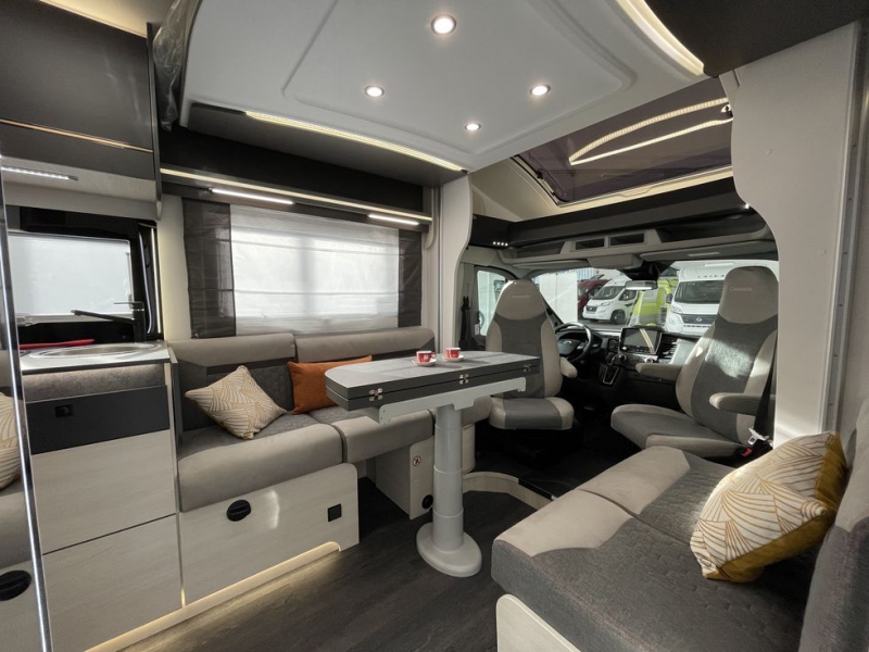 Questo camper profilato Chausson misura 639 cm, la dinette face to face rende abitabile e comodo il living, nel quale è presente il letto matrimoniale basculante elettrico. Il bagno in coda si trova sopra un ampio garage. La meccanica Ford abbinata ad un motore da 170 CV con cambio automatico rende dinamica e piacevole la guida.