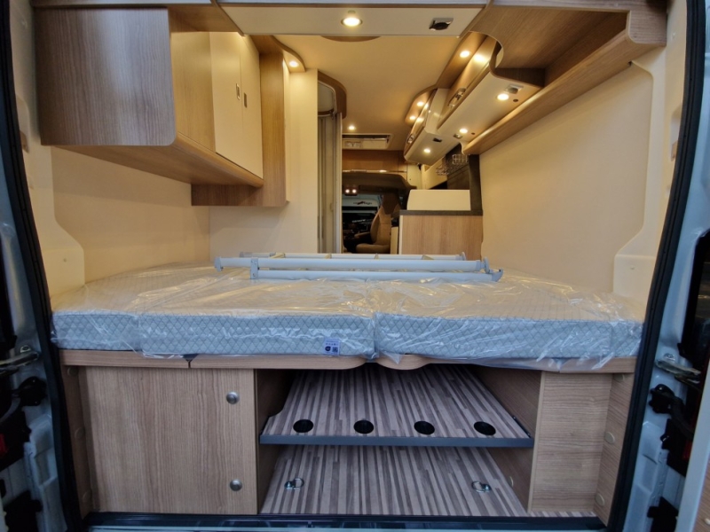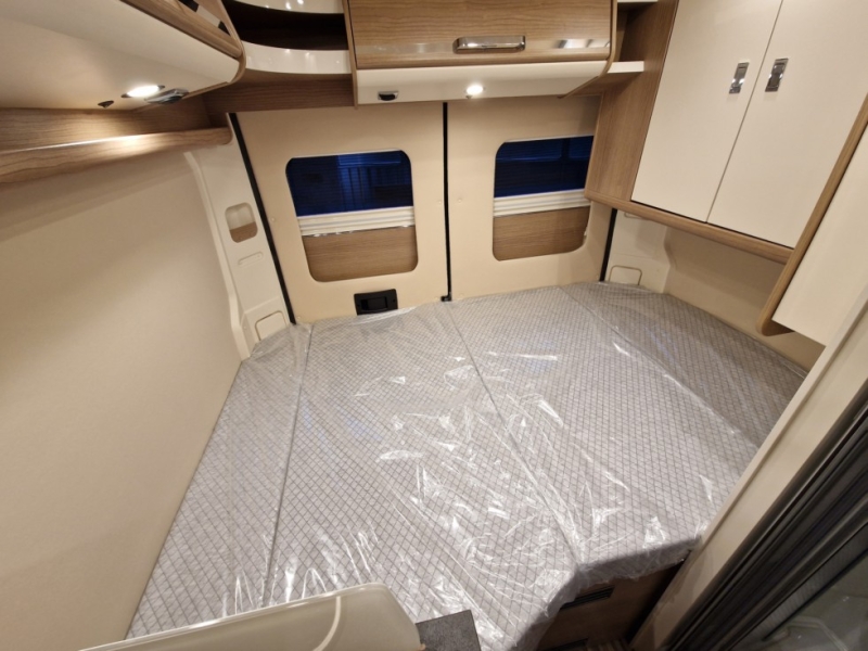 Pacchetto cellula € 1.755,00 Sistema di bloccaggio carichi nel portabagagli Rifinitura cucina Pannello comandi digitale Truma CP Plus Rivestimento tetto con strato di microfibra coibente Serbatoio inserito in un contenitore e isolato Materassi di qualità in schiuma fredda nel letto posteriore Applique da soffitto zona giorno con illuminazione diffusa LED indiretta
