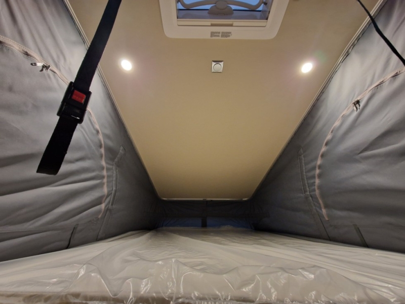Pacchetto Tetto a soffietto € 5.120,00 Supporto del materasso per aerazione da sotto Rivestimento del tetto in VTR Rivestimento in pelle sintetica nella parte interna del tetto Canalina di scolo acqua piovana sopra la porta scorrevole