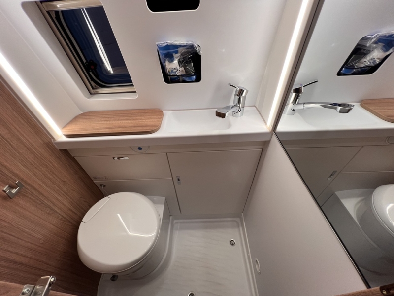 Dotazioni di serie:Pneumatici da 16" Sedile autista e passeggero regolabili in altezza Sistema di oscuranti plissetati per parabrezza e vetri laterali Cruise Control, ESP,ABS,Hill Holder Gavone portabombole per lo stoccaggio di 2 bombole di gas ( da 11 kg ciascuna) Finestra a compasso con oscurante e zanzariera Pareti con isolamento senza ponti termici in schiuma poliuretano Spessore pavimento 25 mm con isolamento Design del mobilio: Tiberino Variante tappezzeria: Alu Combinazione fornello-lavello con 2 fuochi ad accenzione elettrica e copertura in vetro divisa Efficiente a compressore da 95 litri munito di cella freezer da 12,8 litri WC a cassetta Thetford, girevole Termoventilazione a 12 V Sistema di filtraggio dell'acqua "bluuwater" Presa USB nella parte posteriore e in cucina Presa SCHUKO 230 V nella parte posteriore e nella dinette Illuminazione a LED nella zona giorno Illuminazione d'ambiente nel bagno 10 anni di garanzia sull'impermeabilità della scocca
