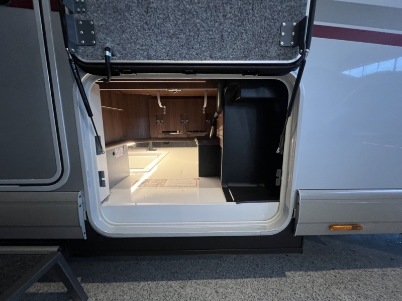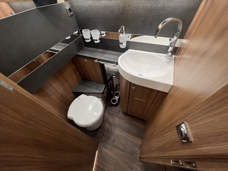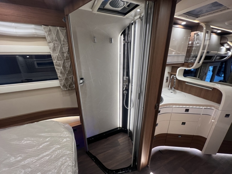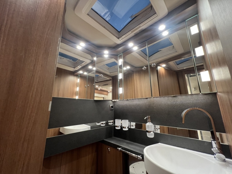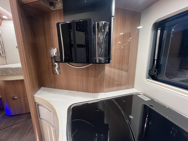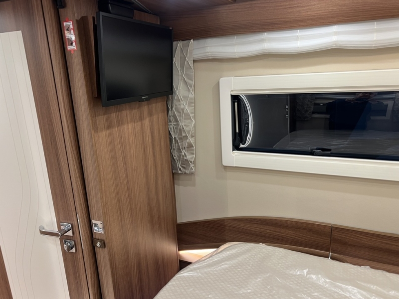 Portata maggiorata da 4.500 kg a 4.800 kg con sospensioni AL-KO X2 Concetto colore esterno Silverline Striscia LED sulla veranda a tetto Pacchetto di prese aggiuntive Macchina del caffè Smart TV a LED 32" per sistema di estrazione TV Sistema di camera posteriore con due obbiettivi con schermo a colori da 7" Pavimento moquette cabina guida Corredo letto