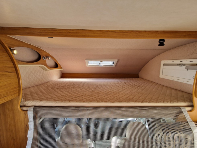 Camper mansardato con doppia dinette e con letto a castello posteriore.